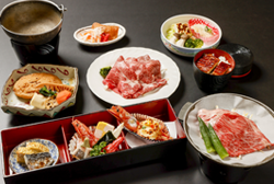 - 飛騨牛陶板、飛騨牛しゃぶしゃぶ、前菜、口取り、焼き物、煮物、ミニうな丼、香の物、汁物